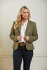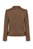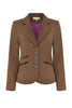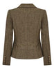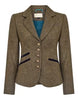 This gorgeous wool green herringbone tweed jacket has a beautifully fitted and tailored fit for a super flattering and classic silhouette. The wool is beautifully soft and woven with three shades to great a classic herringbone design. It has rich, dark navy velvet trims to the under collar, pocket openings and dark gold military style buttons.