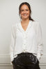 A beautiful and easy to wear pure silk cream shirt with feminine ruffle details. The semi-sheer Emily has a curved shirt style hem and small side slits, making it perfect to wear either tucked in or out, or even half and half.